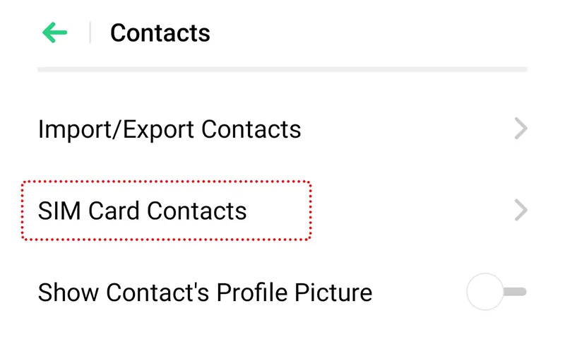 - Bazı cihazlarda, kullanıcının gitmesi gerekebilir.Ayarlar> Kişiler> SIM kart kişiS. Coloros 7.0 ve üzerindeki cihazlar içinTelefon Uygulaması> Kişiler>Dokun: Sağ üst köşede ve ardından tıklayınAyarlar> SIM kart kişileri.