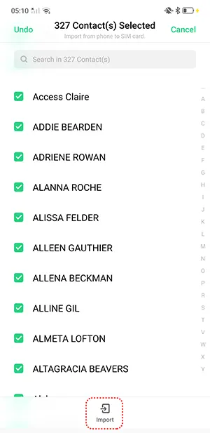 - Sonunda, dışa aktarmak istediğiniz kişileri seçin veya dokununTümünü seçin> İçe Aktarın.