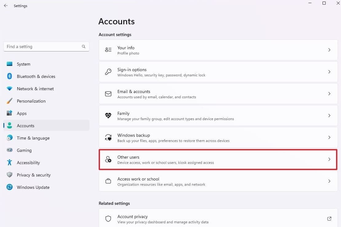 - 'Hesaplar' bölümüne gidin ve ardından 'Diğer Kullanıcılar' seçin.