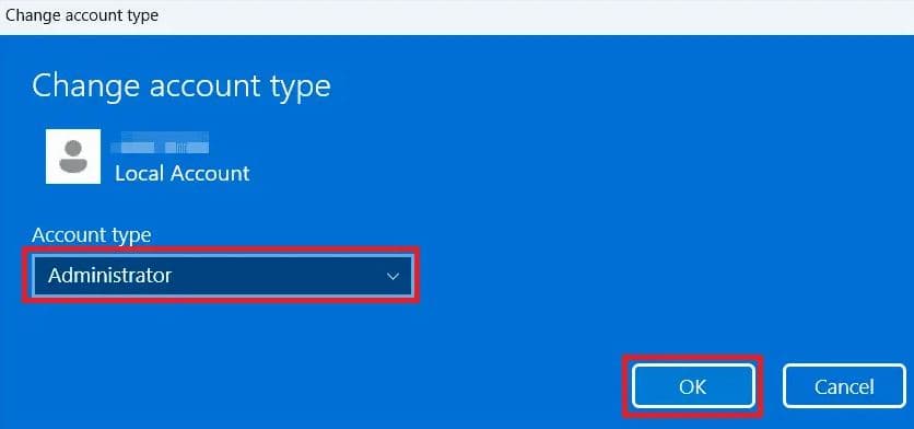 - Hesap Türü penceresinde, Hesap Türü açılır kutusundan “Yönetici” yi seçin ve “Tamam” ı tıklayın.