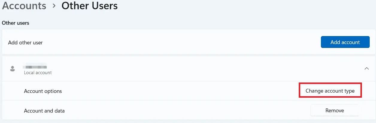 - Yönetici yapmak istediğiniz kullanıcı hesabını seçin ve hesap seçeneklerinin yanında “Hesap Türünü Değiştir” i tıklayın.