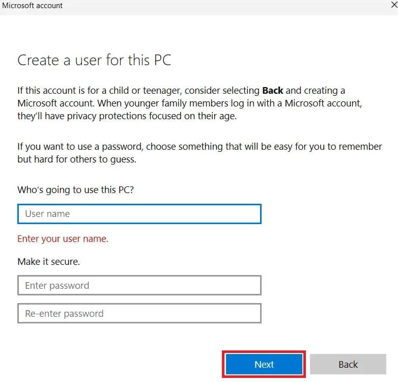 - Başarılı yerel hesap oluşturma için kullanıcı adınızı, şifrenizi ve ipucu şifrenizi girin.