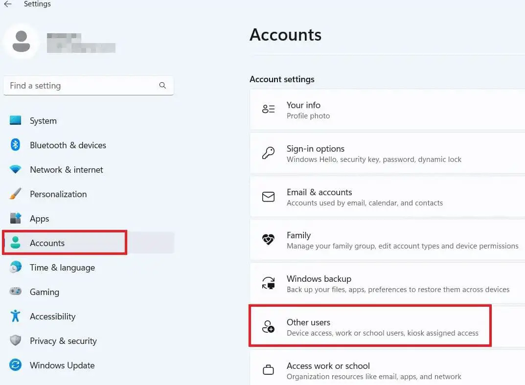 - Sol kenar çubuğuna gidin ve 'hesaplar', ardından sağ bölmedeki 'diğer kullanıcılar' seçin.