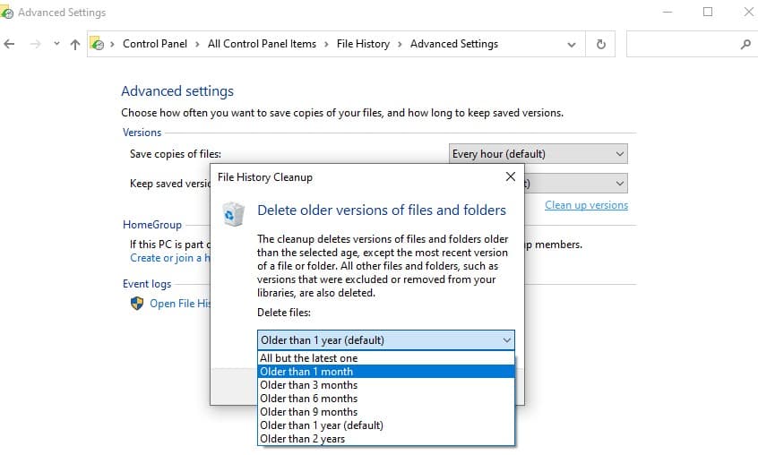 - Dosya geçmişinin anlık görüntülerinizi ne kadar tuttuğunu değiştirmek için sol bölmedeki gelişmiş ayarları tıklayın.