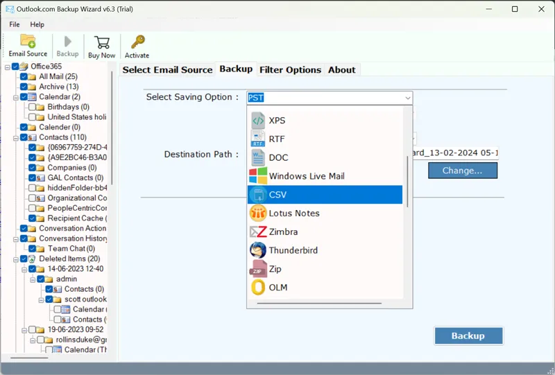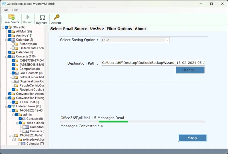 - Son olarak, Outlook.com e -postasını Excel Transfer İşlemi'ne tıklayarak başlayın.Yedeklemedüğme.