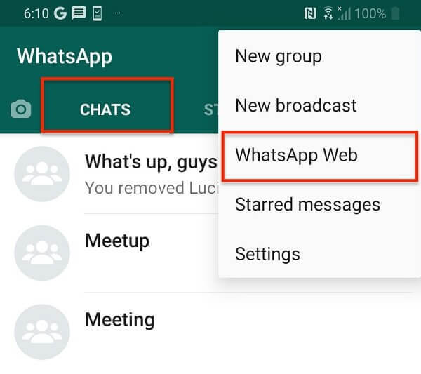 - 1. Buradaki ilk adım, WhatsApp Web'e bilgisayarınızdaki erişmektir. Bunun için, WhatsApp'ınızı mobil cihazlarda açmanız ve ekranın üst kısmından üç noktalı simgeye dokunun. Ardından WhatsApp Web seçeneğini tıklayın.