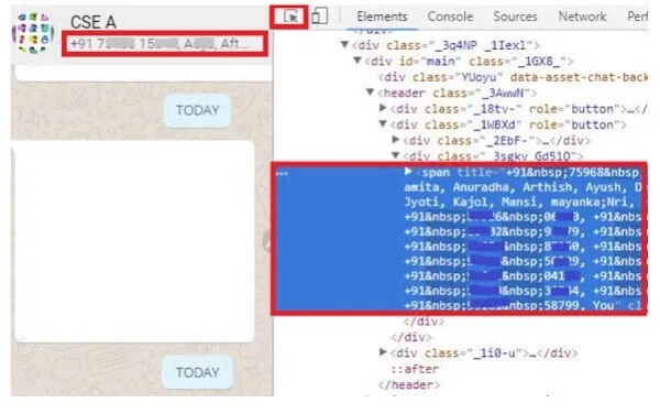 - 9. Grup kişilerini bulduktan sonra, bunları seçmeniz ve ardından bu bölüme sağ tıklamanız gerekir. Ardından, WhatsApp Grubu Kişilerinin öğesini veya dış HTML'sini kopyalamayı seçebilirsiniz.