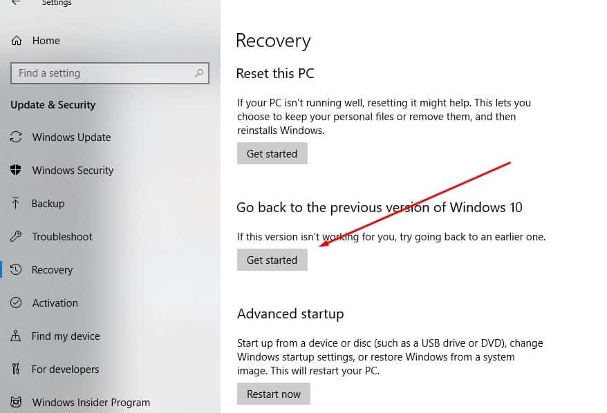 - “Windows 10'un önceki sürümüne geri dön” altında, tıklayınBaşlamakve istemleri takip edin.