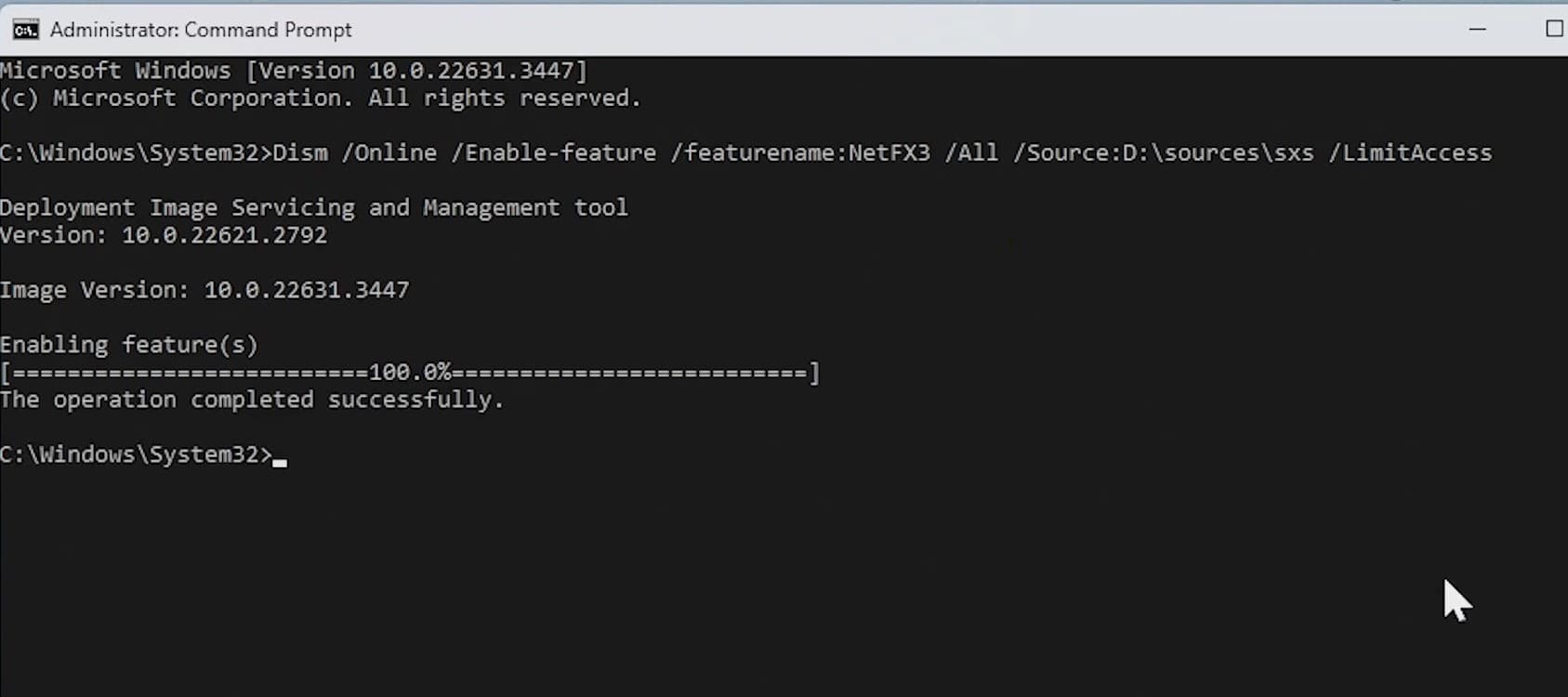 Dism /Online /Enable-Feature /Feeturename: Netfx3 /All /Kaynak: D: Sourcessxs /Limitaccess