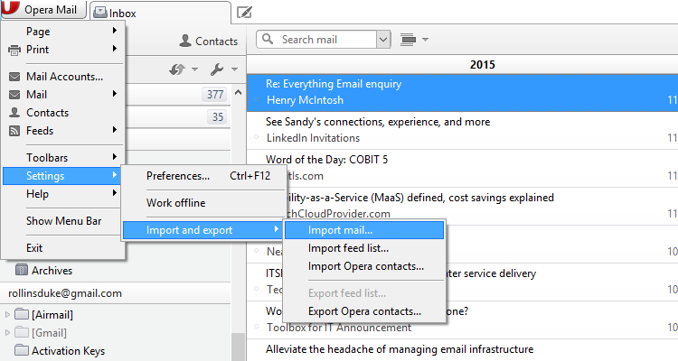 - Opera Mail'i başlatın, burada Opera Postası'na tıklayın ve seçinAyar>>İthalat ve Dışa Aktar>>Posta İçe Aktar.