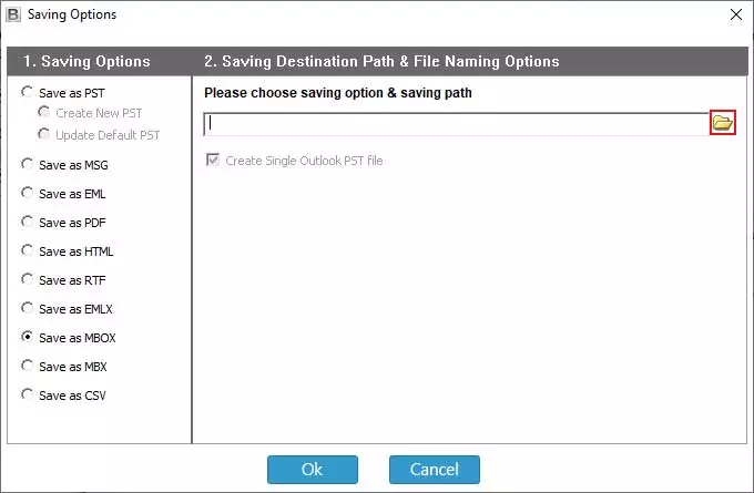 3 – Daha sonra seçinMBOXmevcut kaydetme seçeneklerinden birini seçin veDosyaHedef yola göz atmak için simge.
