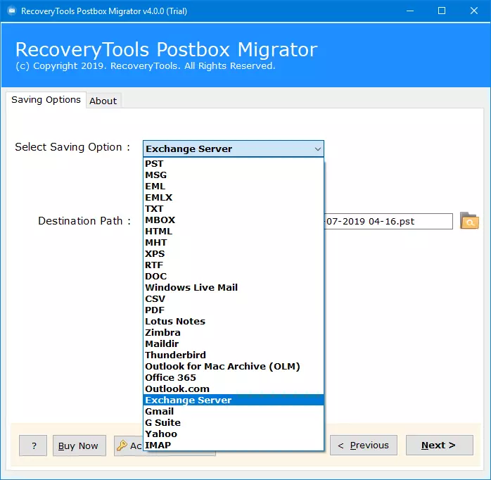 - Kaydetme Seçenekleri listesinden Exchange Server seçeneğini seçin.