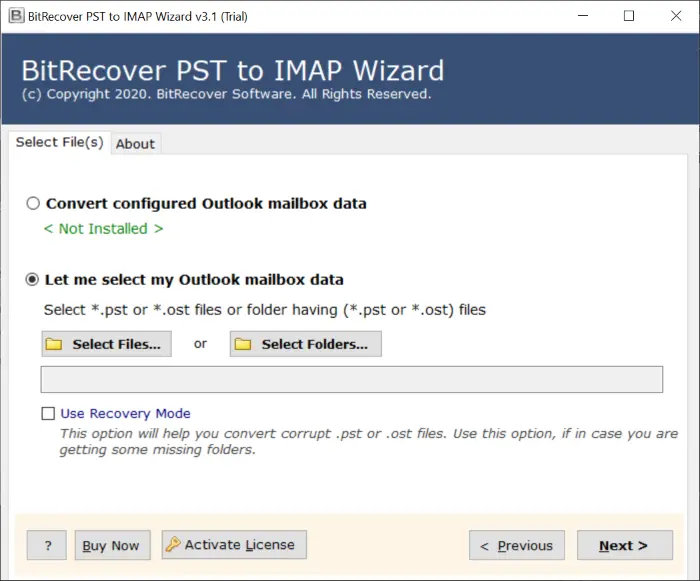 - Araç, yapılandırılmış Outlook'tan PST dosyaları ekleyebilir. Ayrıca PST dosyalarını manuel olarak eklemek için çift seçenekler sunar, yaniDosyaları seçin veya klasörleri seçin.