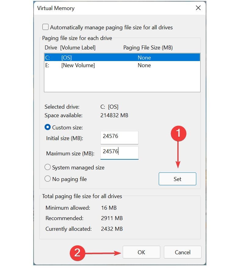 - Ardından, istediğiniz sanal bellek boyutunu girin ve seçinTAMAM.