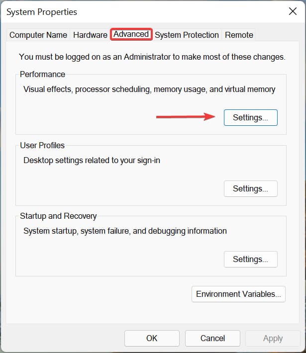 - Gelişmiş sekmesine geçin, Performans Bölümü altında ayarları seçin