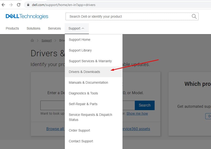 - İlk olarak, cihaz üreticisinin resmi web sitesini ziyaret edin. eski içinDell Destek