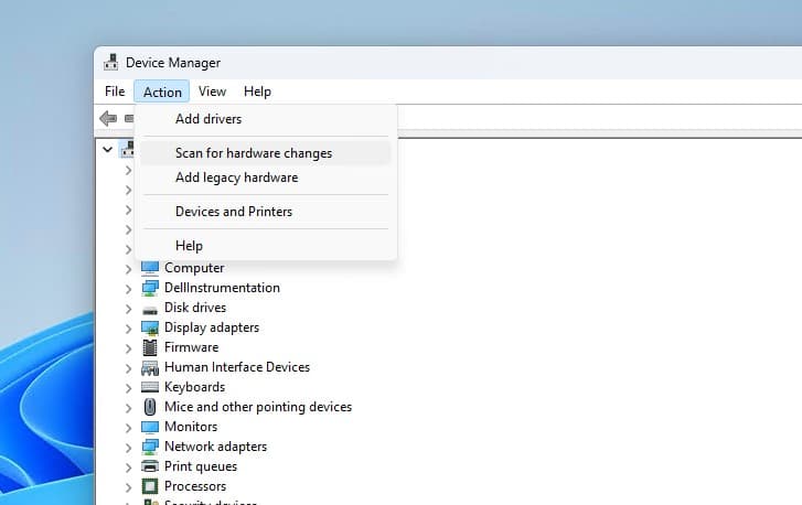 Yine aygıt yöneticisini açın Eylem'e tıklayın ve donanım değişiklikleri için tarayın.