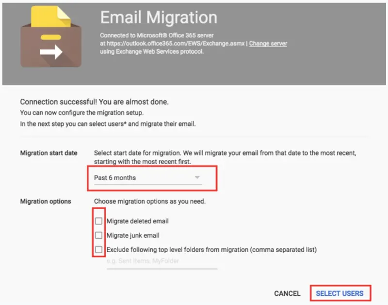 - Kontrol etToplu Mod kullanınOffice 365'ten G Suite'e toplu taşıma için seçenek onay kutusu.