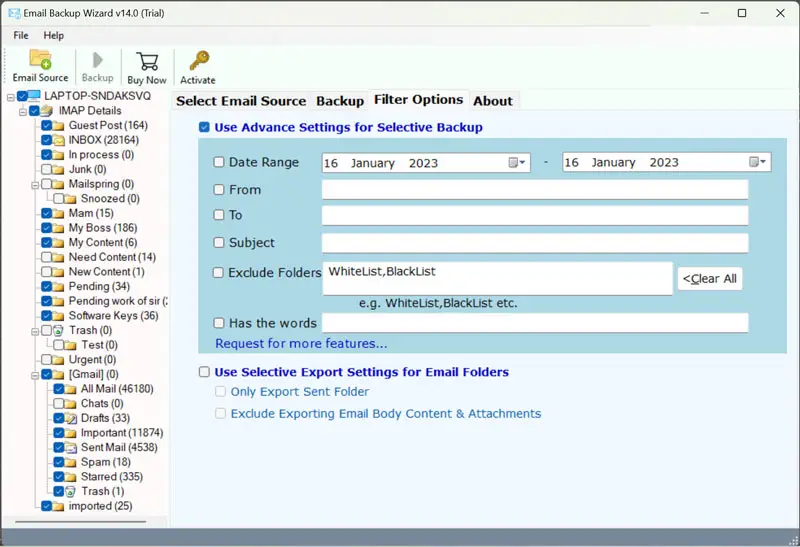 - Gelişmiş Filtre seçeneği, kullanıcıların belirli e -postaları tarih aralığı, TO'dan, konu vb. Yoluyla taşımasına olanak tanır. Ayrıca, istenmeyen klasörleri hariç tutabilirsiniz.
