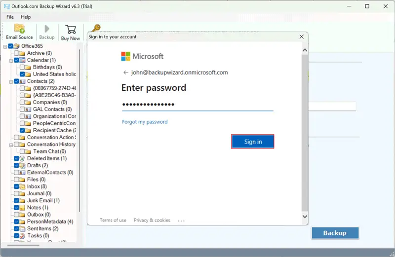 - Microsoft 365 e -posta adresinizi girin ve tıklayınYedekleme.