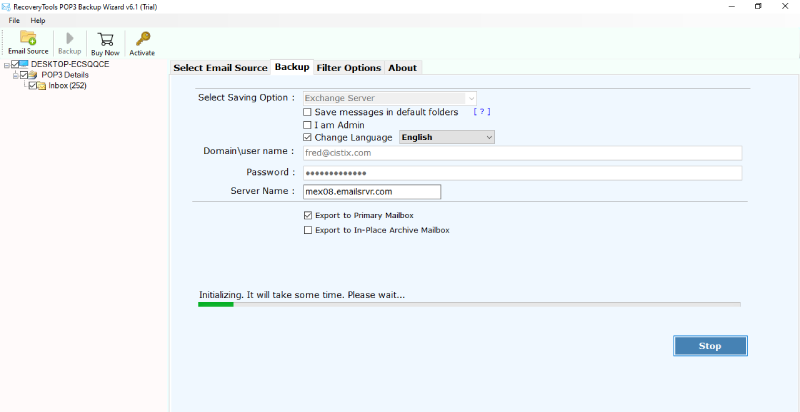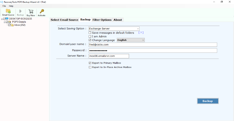 Son olarak,Yedeklemedüğme. Bu, Pop3'ün çevrimiçi göç alışverişi yapmak için başlar. Bu işlem tamamlandıktan sonra değişim hesabınıza gidebilirsiniz.