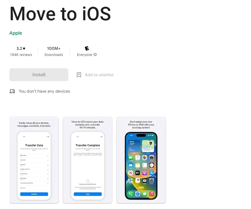 Verileri Android'den iPhone'a aktarmak için üçüncü taraf bir uygulamanın yardımına ihtiyacınız var. Diğer uygulamaların verileri kaybetmesi veya sızdırması nedeniyle iOS'a Taşı uygulamasını kullanabilirsiniz.