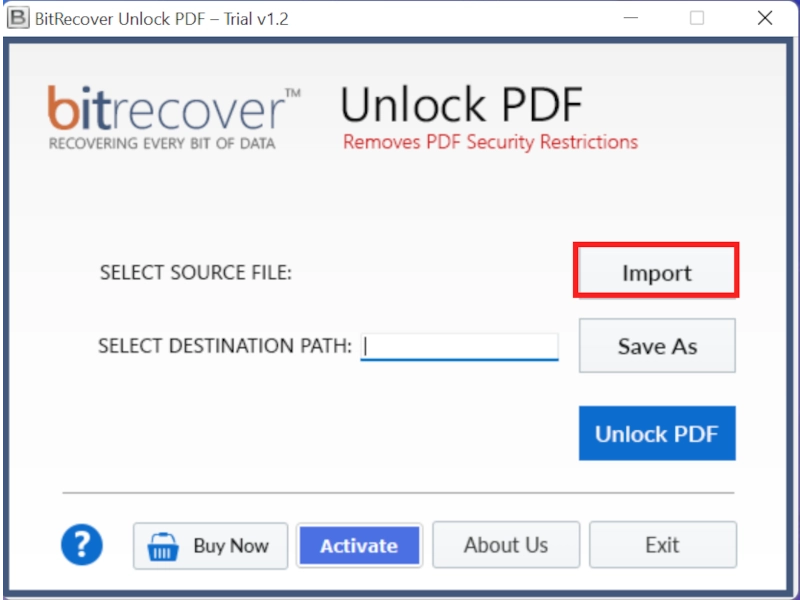 - Birinci,İndir ve YükleBilinmeyen parolayı PDF'den kaldırma aracı ve İçe Aktar seçeneğini seçin.