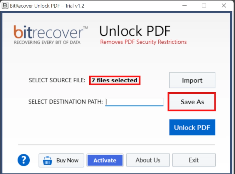 Bu profesyonel bir çözümBilinmeyen şifreyle PDF'nin kilidini zahmetsizce açın. PDF Lidinger Yazılımını kullanarak kullanıcılar bu durumun üstesinden gelebileceklerdir. Ayrıca, bu araç toplu dosyaları son derece hızlı ve güvenli bir ortamda işleyebilir. İkincisi, bu yardımcı program izin parolası olmadan parolayı PDF'den tamamen kaldıracaktır. Şimdi yardımcı programın gerçek çalışma kılavuzunu ortaya çıkaralım. Kullanıcı, kullanıcının PDF bilinmeyen şifrenin kolayca kilidini açabileceği bu basit adımları izlemelidir.