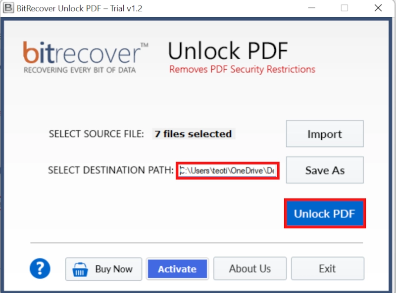 - Daha sonra, hedef yolu göstererekPDF kilidini açİşlemi tamamlamak için düğme.