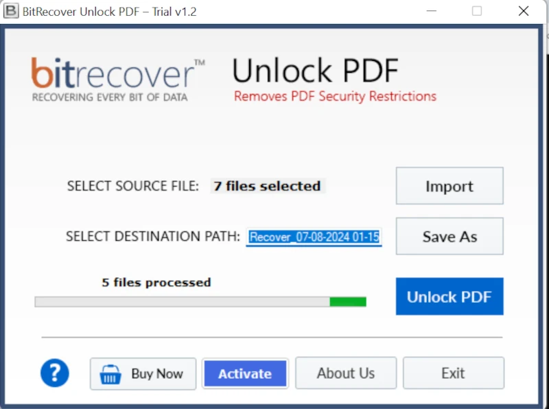 - Bundan sonra, kullanıcı yazılıma kadar beklemeliPDF'den güvenliği kaldırırdosyalar ve işlem tamamlanana kadar.
