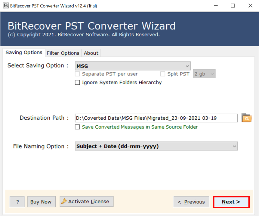 Küçük, orta veya büyük ölçekli bir işletme işletmesi iseniz ve Outlook e-postasını MSG olarak kaydetmek için güvenli bir yönteme sahip olmak istiyorsanız, profesyonel bir çözüm gereklidir.Bitrecover PST Dönüştürücü SihirbazıOutlook e -postasını MSG dosyasına dışa aktarmak için kesin ve güvenilir bir çözüm sağladığı için bu durumu yerine getirir.
