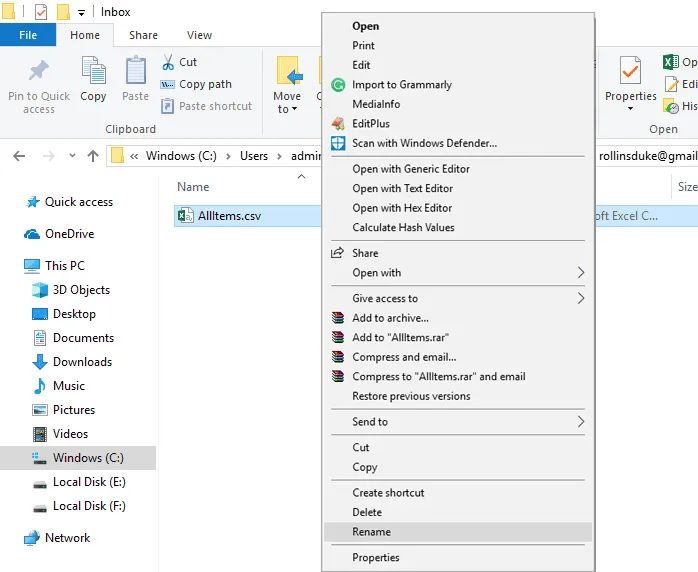 - Ortaya çıkan CSV dosyasını seçin, üzerine sağ tıklayın ve seçinYeniden isimlendirmekseçenek.