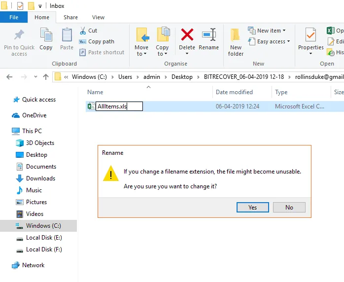 - Yeniden adlandırın.csv dosyası .xlsformatlar ve basınEvetdüğme.