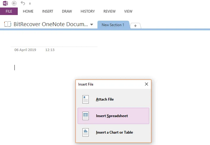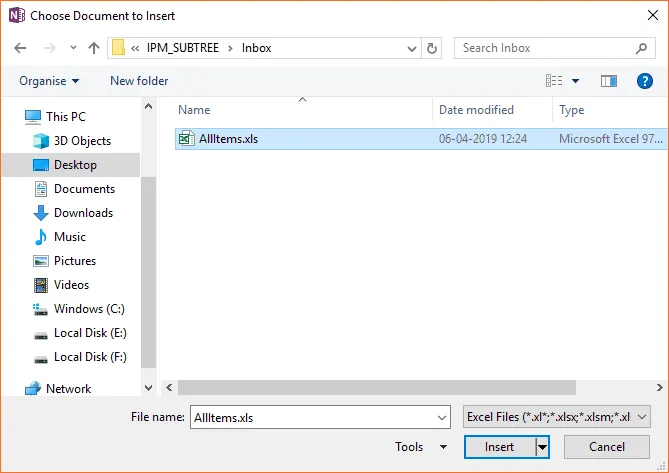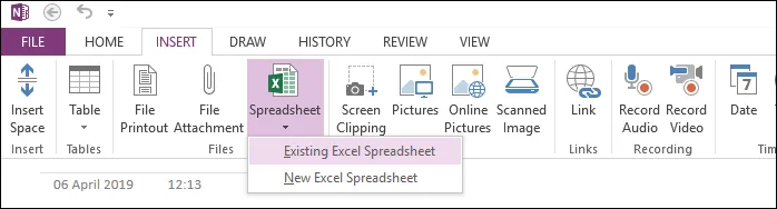 - KoşmakMicrosoft Onenoteve seçSOKMAK>>E -tablo>>Mevcut Excel elektronik tablo seçeneği.