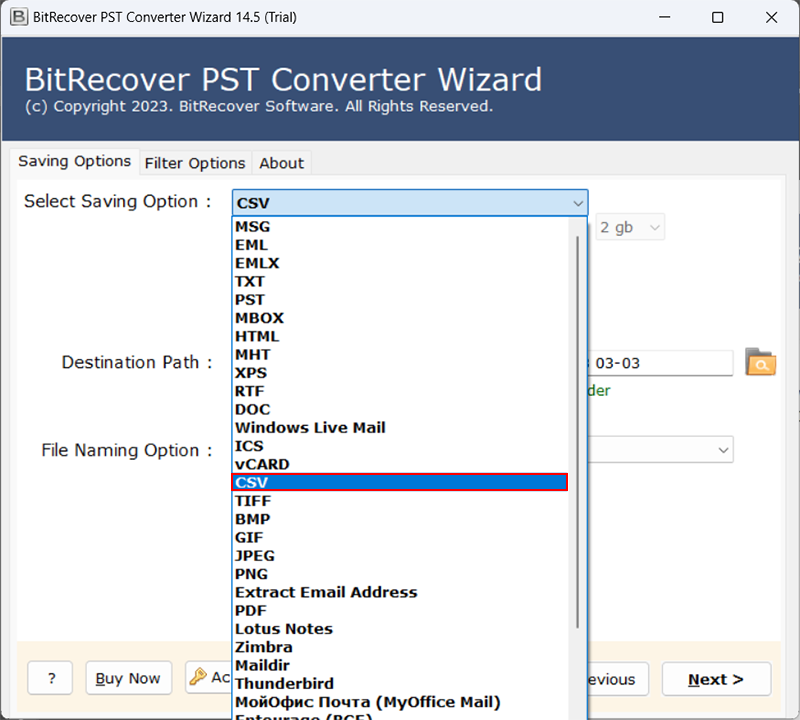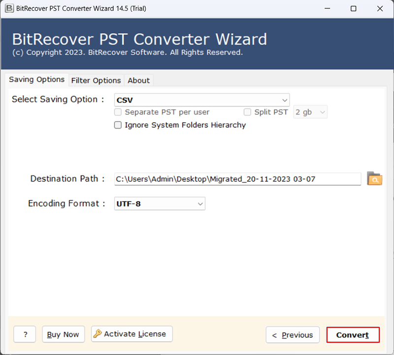 - BasınDönüştürmekOutlook PST'yi CSV biçimine dönüştürmek için düğme.