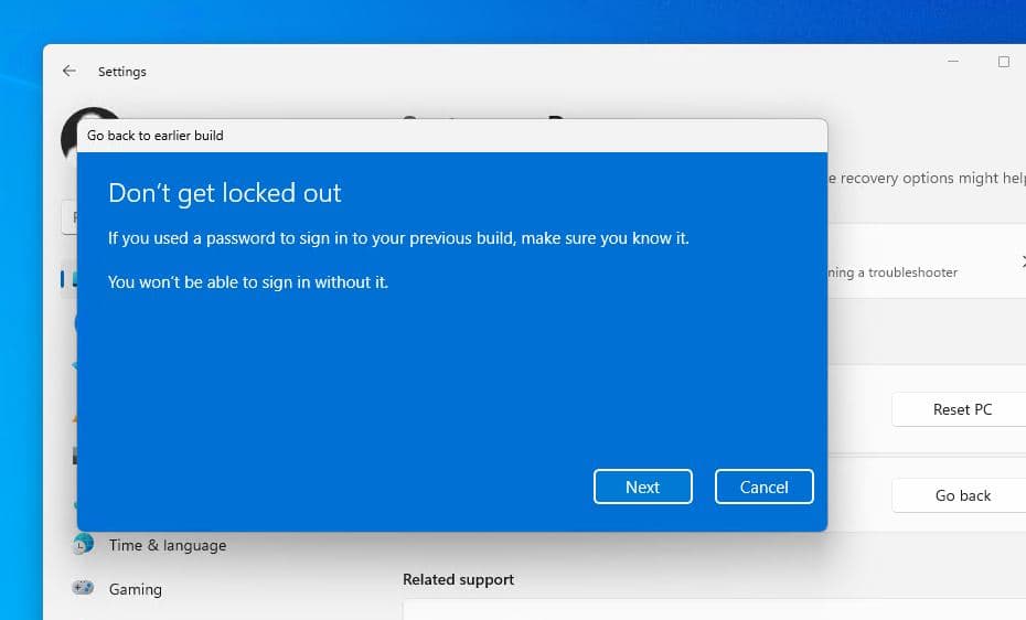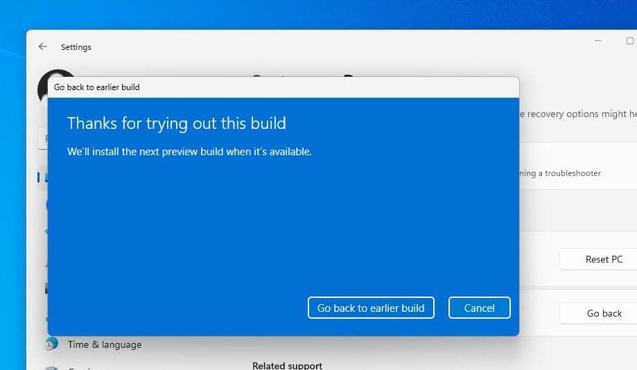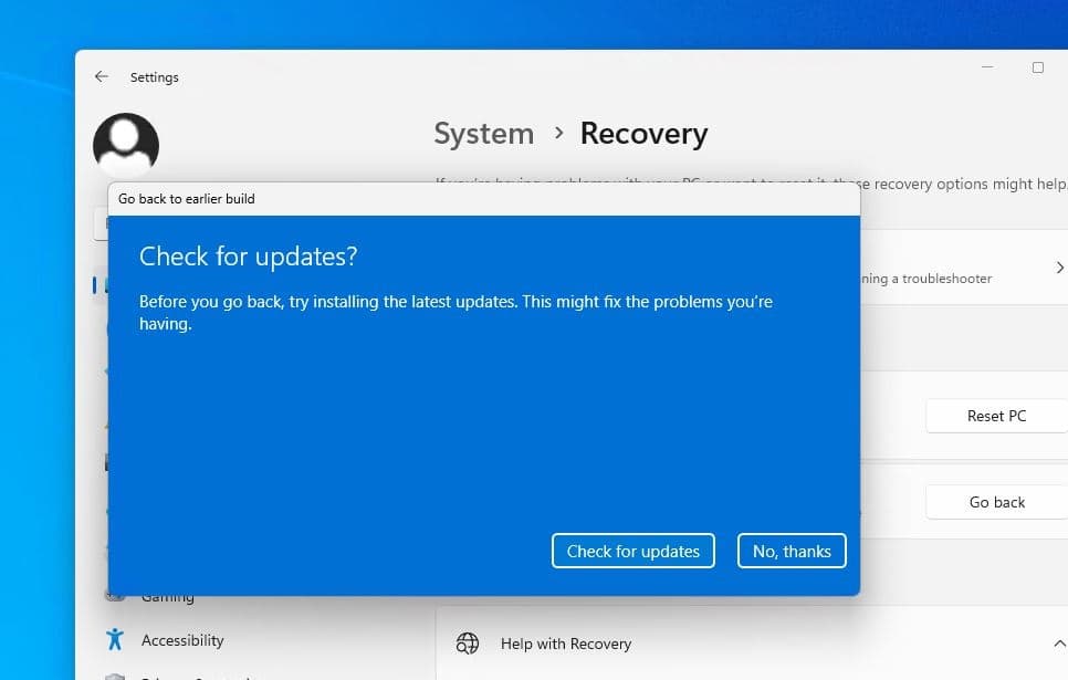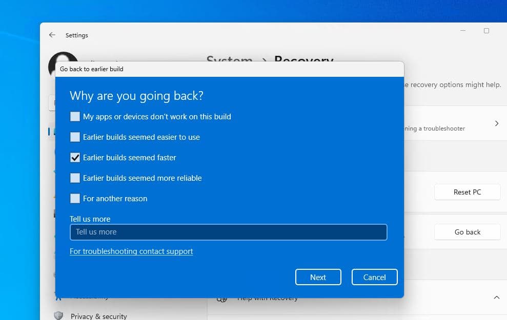 Windows 11'deki kurtarma ayarları, en son güncellemeyi kaldırma ve önceki derlemeye gitme seçeneği sağlar