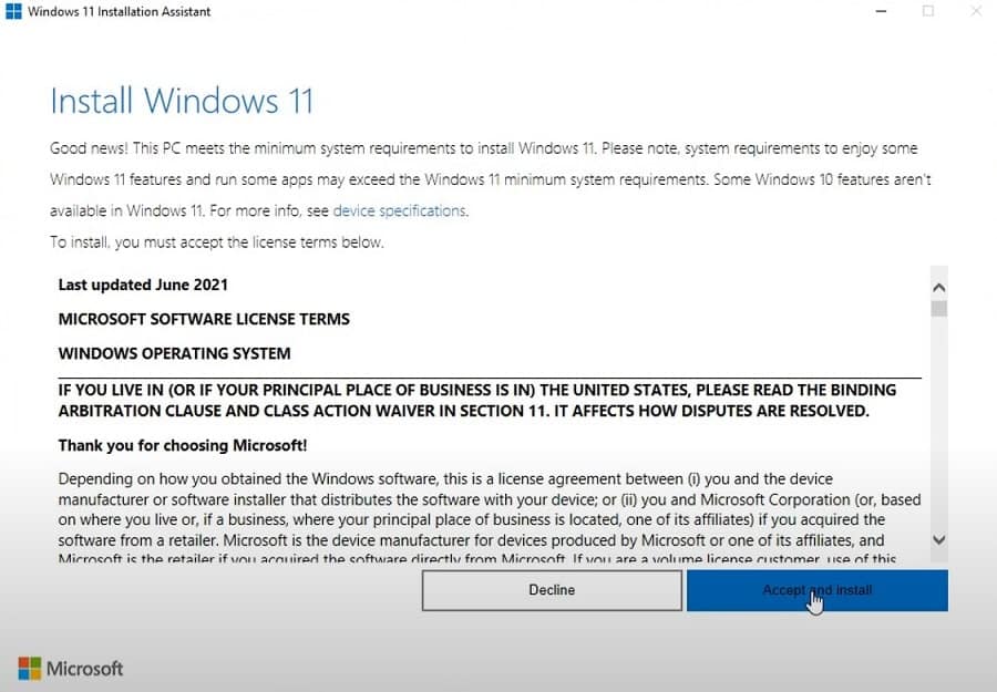 - Microsoft Server'dan Windows 11 güncelleme dosyalarını indirmeye başlamak için lisans şartlarını kabul edin.