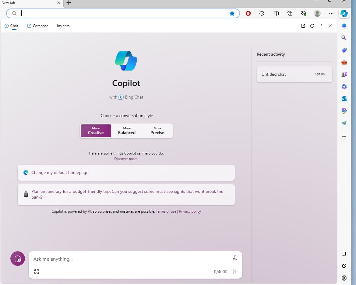Kenar kopyasıMicrosoft Edge'in Bing ile farklı modlarda sohbet etmenizi sağlayan yeni bir özelliğidir,"Yaratıcı"ChatGPT 4 kullanan mod. Kenar copilot'un nasıl erişileceği ve kullanılacağı ve muhteşem içerik ve GPT-4 ve Dall-E 3 ile görüntülerin nasıl oluşturulacağı aşağıdaki gibidir.