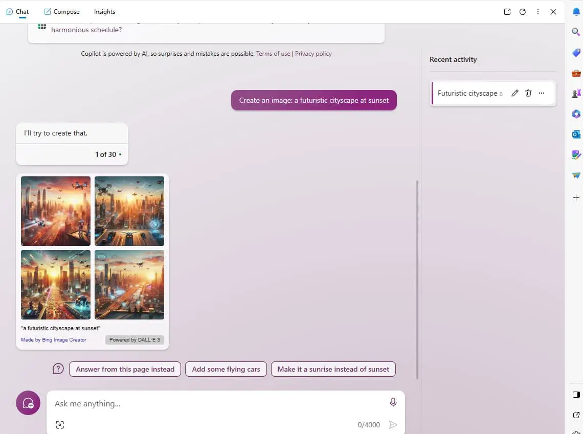 Ayrıca, Dall-E kullanarak AI görüntüleri oluşturmak için Edge Copilot (Creative) modu kullanabilirsiniz.