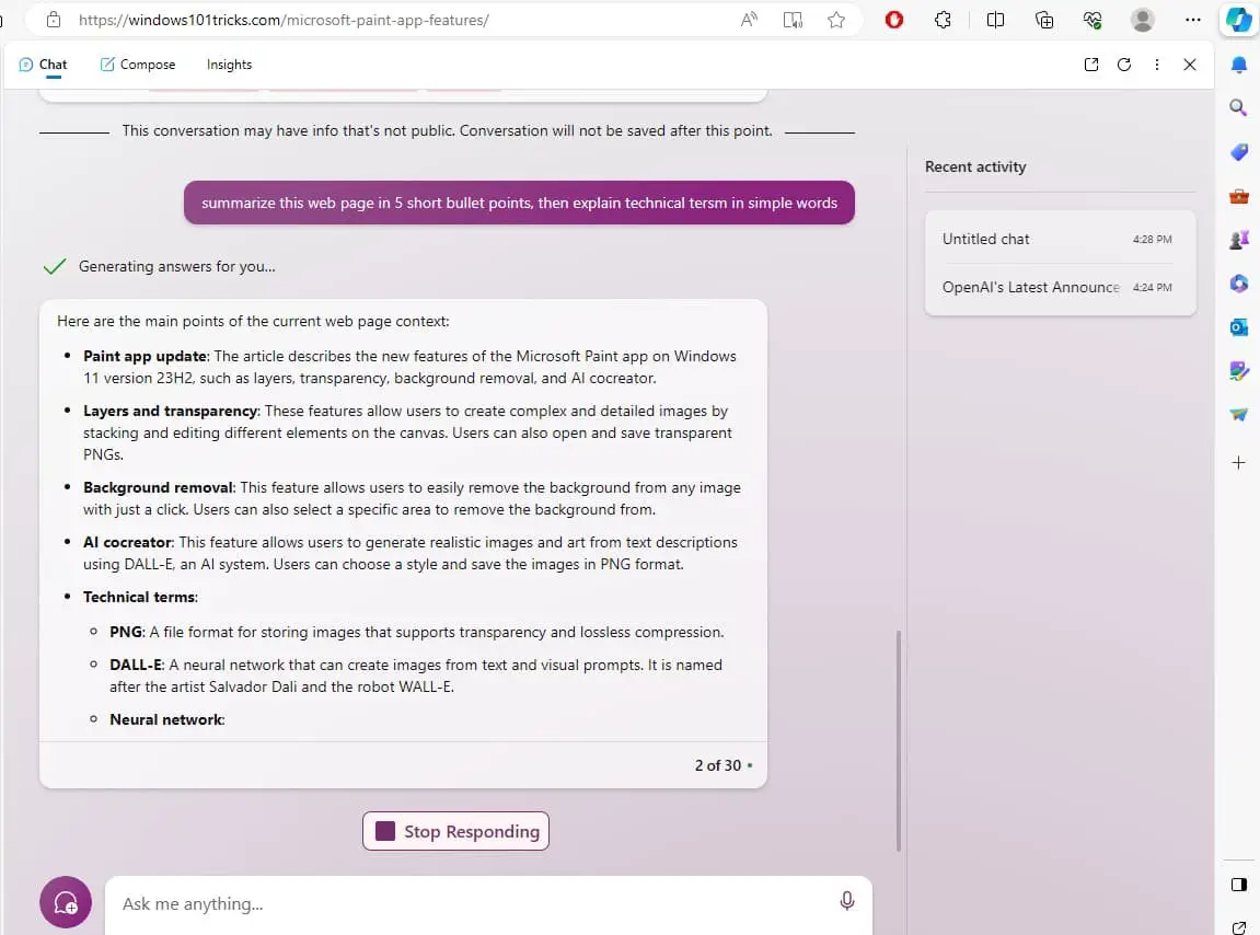 Ayrıca Bing'den içeriğinizi yeniden yazma, iyileştirme veya optimize etme konusunda size yardımcı olmasını isteyebilirsiniz. Örneğin, bir web sayfasını özetlemek ve açıklamak istiyorsanız, istediğiniz web sayfasına gidin, Copilot simgesine tıklayın ve Bing'den sizin için özetlemesini isteyin. Bing, web sayfasının özlü bir özetini oluşturmak ve ana noktalarını açıklamak için GPT-4'ü kullanacaktır.