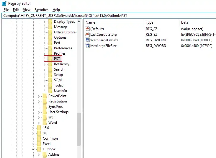 Kayıt Defteri Düzenleyicisi'ni açın, HKEY_CURRENT_USER \ Software \ Microsoft \ Office \ 15.0 \ Outlook \ PST adresine gidin ve maksimum dosya boyutu oluşturun ve dosya boyutu girişlerini uyarın. MaxFilesize'yi 107374182400 (100 GB için) olarak ayarlayın. Değişiklikleri uygulamak için Outlook'u yeniden başlatın.