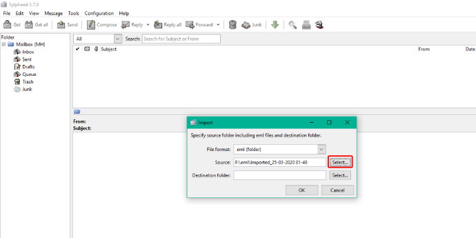 - Şimdi, Sylpheed hesabınızda bir hedef klasör seçin.Seçmeseçenek.