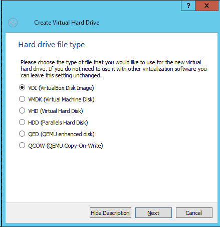 - VDI:Özellikle bu VDI dosya biçimi, verileri “.vdi” dosyası uzantısı taşıyan dosyalarda saklayan VM VirtualBox'a özgü disk görüntüsüdür.