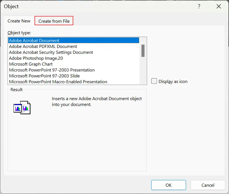 Eğer "Dosyaya bağlantı”Seçenek, ardından bu teknik“ Dosyanın içeriğini belgenize ekler ve kaynak dosyaya bir bağlantı oluşturur. Kaynak dosyadaki değişiklikler belgenizde yansıtılacaktır. ”