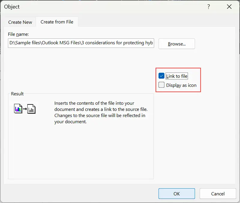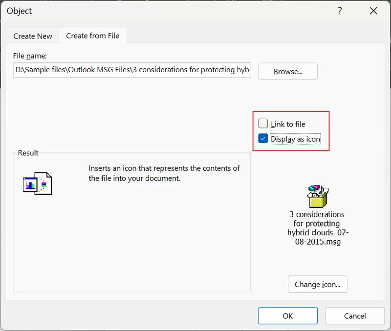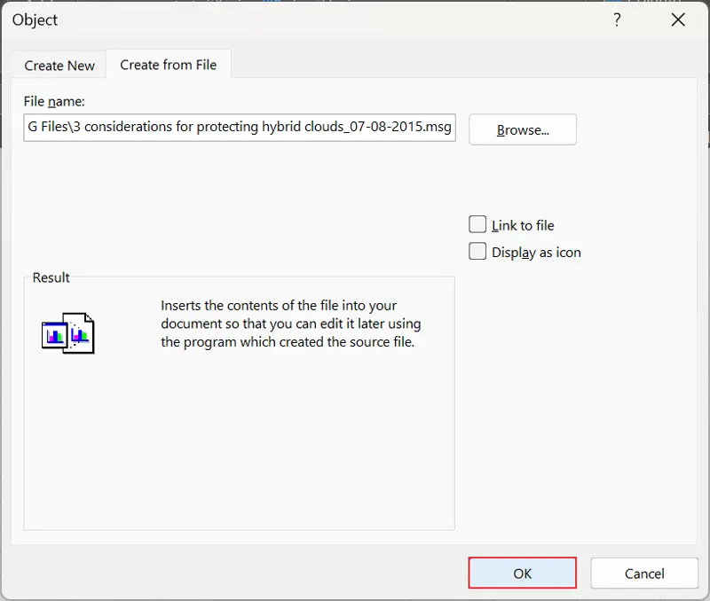 - EtkinleştirDosyaya bağlantıExcel'e bir msg dosyası eklerken seçenek ve tuşTamam.