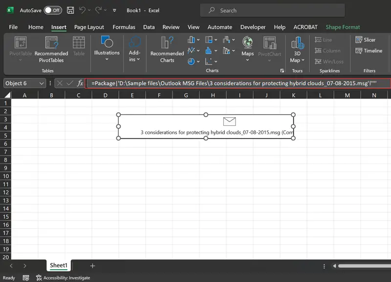 - MSG dosyanızbaşarıylaExcel sayfasına eklendi vesimge olarak görüntülenir.