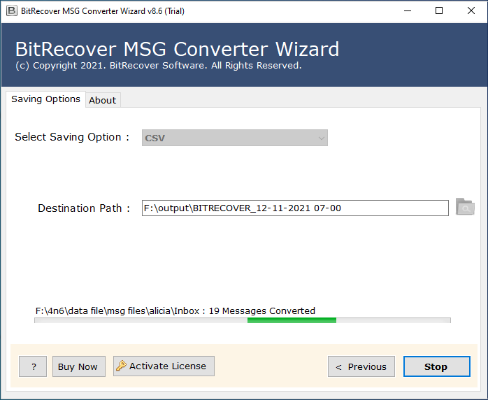 - Üzerine tıklayınDönüştürmekDüğme Ardından, yazılım MSG'yi Excel sayfasına dönüştürmek için işlemi anında başlatır.