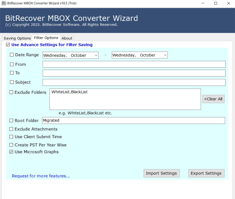 • İlerleme Filtreleri:İlerleme Filtresi seçeneği, kullanıcıların Mbox'larını tarih aralıkları, konu, gönderen bilgileri ve alıcı detayları gibi farklı parametreler temelinde ayırmalarına yardımcı olur. Bu, kullanıcıların verilerini farklı ayrılmış dosyalar temelinde ayırmasına ve düzenlemelerine yardımcı olur.