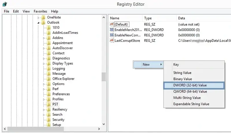 2. Gezin: HKEY_CURRENT_USER \ Software \ Microsoft \ Office \ 16.0 \ Outlook \ Seçenekler \ Mail