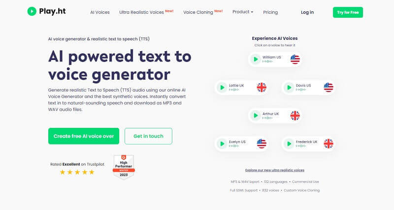 Play.ht, IBM, Microsoft, Google ve Amazon gibi endüstri liderlerinden yapay zekanın gücünü kullanan güçlü ve gerçekçi bir metin-konuşma aracıdır. Gelişmiş teknolojisi ile metni zahmetsizce yüksek kaliteli ses ve seslendirmeler haline getirerek çarpıcı projeler oluşturmanıza olanak tanır.